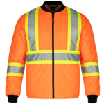 68 gsm – 2 oz./yd2 – 3.5 oz./lin. yd 100% polyester taffeta with wind resistant and water repellent finish. Insulation: 150 gsm 100% polyester.  Knit Collar and cuff. Two exterior side entry pockets and one inner patch pocket. Pocket embroidery access. YKK front zipper.  4” hi-vis contrast band with 2” reflective tape on front and back body and sleeves.  Meets CSA standards.